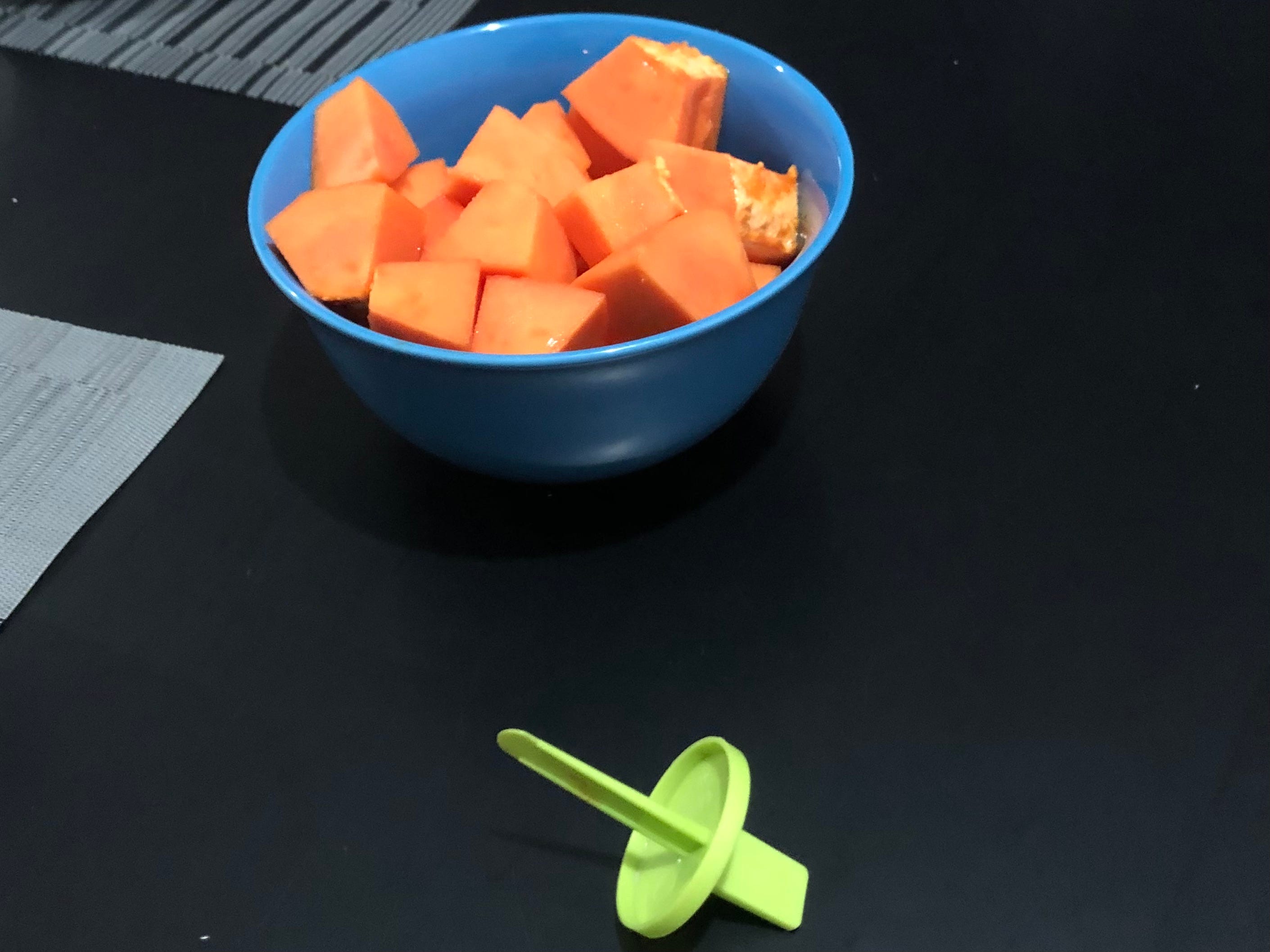 Le partí un poco de papaya a Sofi, y en lugar de aceptarme un tenedor quiso este soporte para hacer paletas de hielo.